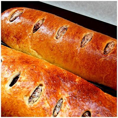Now, roll up the dough jellyroll style, from the long side. Pinch the seam closed to seal. (I didn't do this.) Very carefully transfer the filled log to one of the lined cookie sheets, seam side down. Bring the ends of the log around and seal the ends together, forming a ring, tucking one end into the other and pinching to seal.
